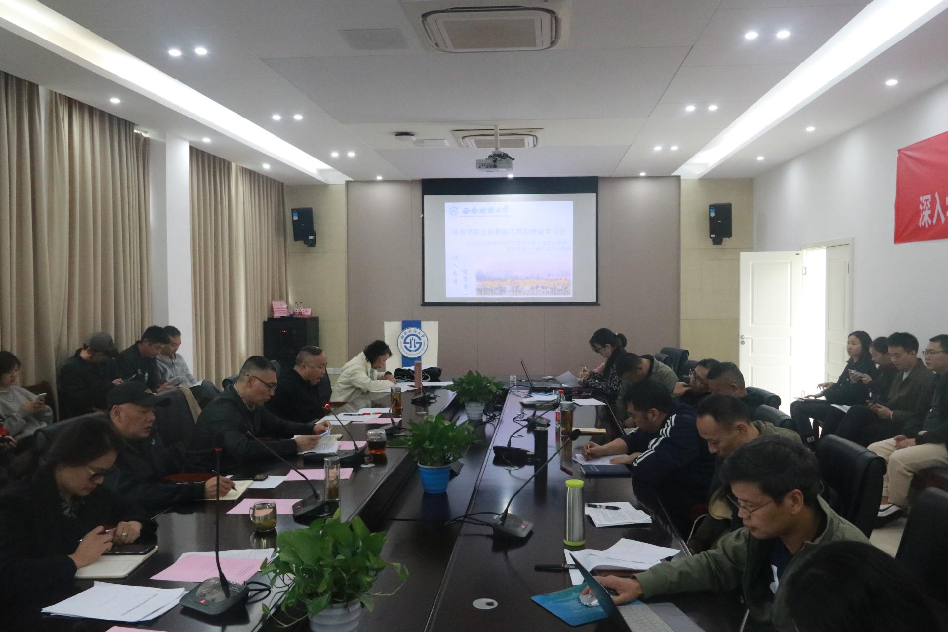 10月19日,乐动在游泳池201会议室召开全体教职工政治理论学习会,深入学习贯彻中央财经委员会第十次会议精神、四川省委十一届九次全会精神。学院全体教职工参加,会议由杨远波院长主持。